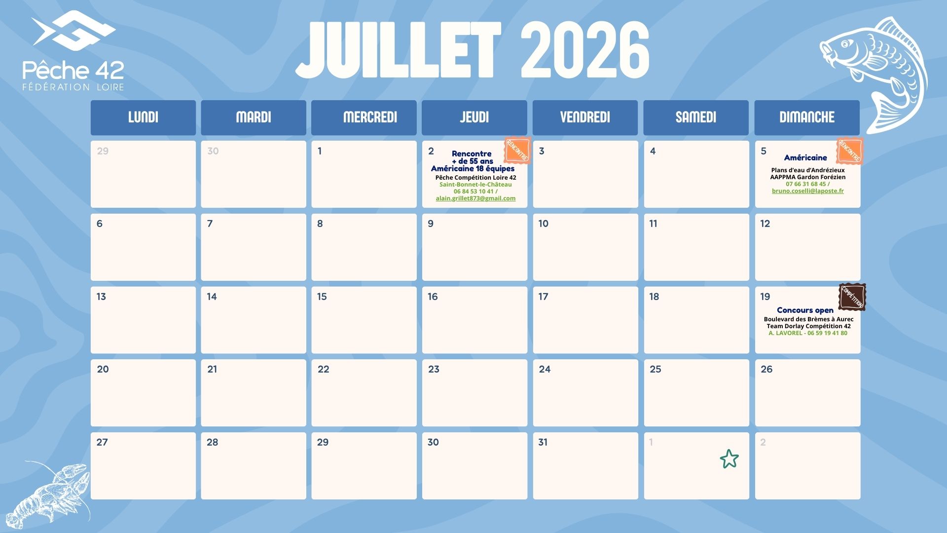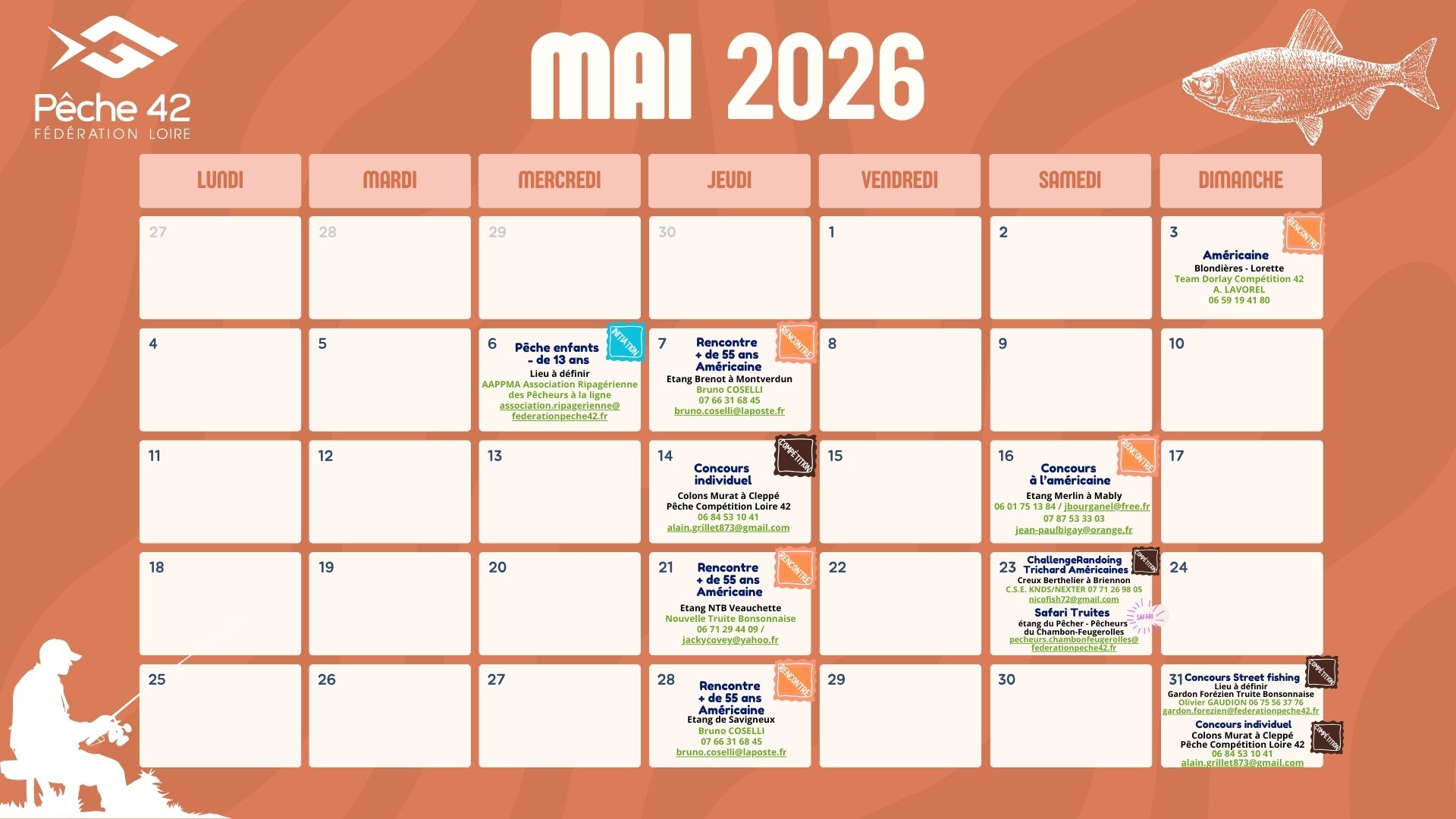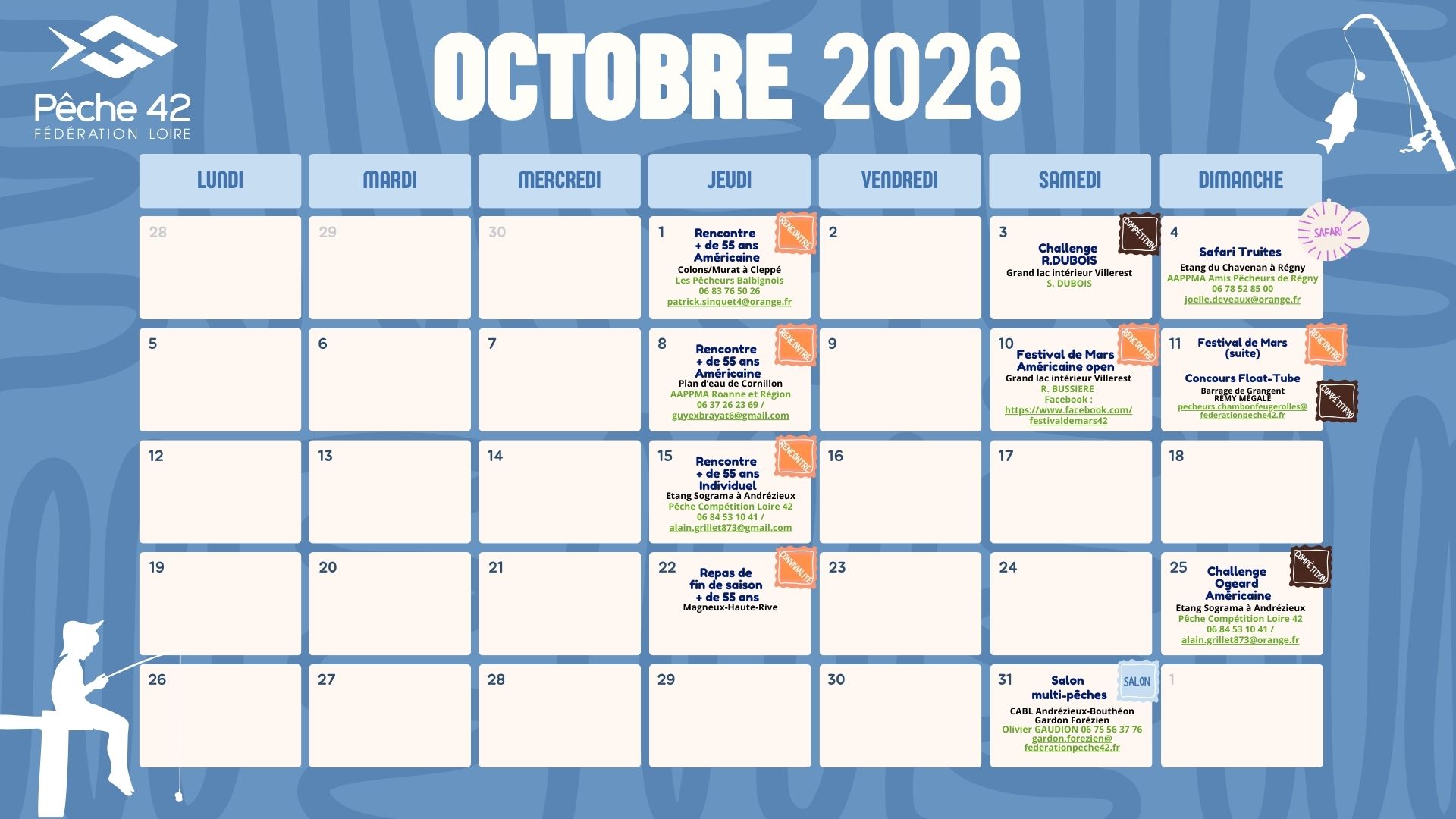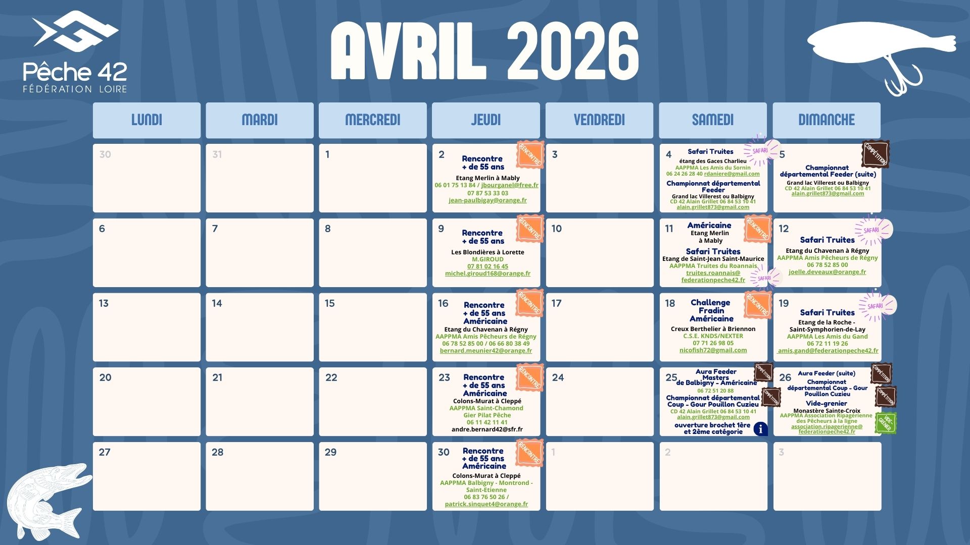 La Fédération de Pêche de la Loire a compilé les dates des événements pêche dans la Loire (grâce aux retours des AAPPMA, des clubs, des structures de pêche du département).