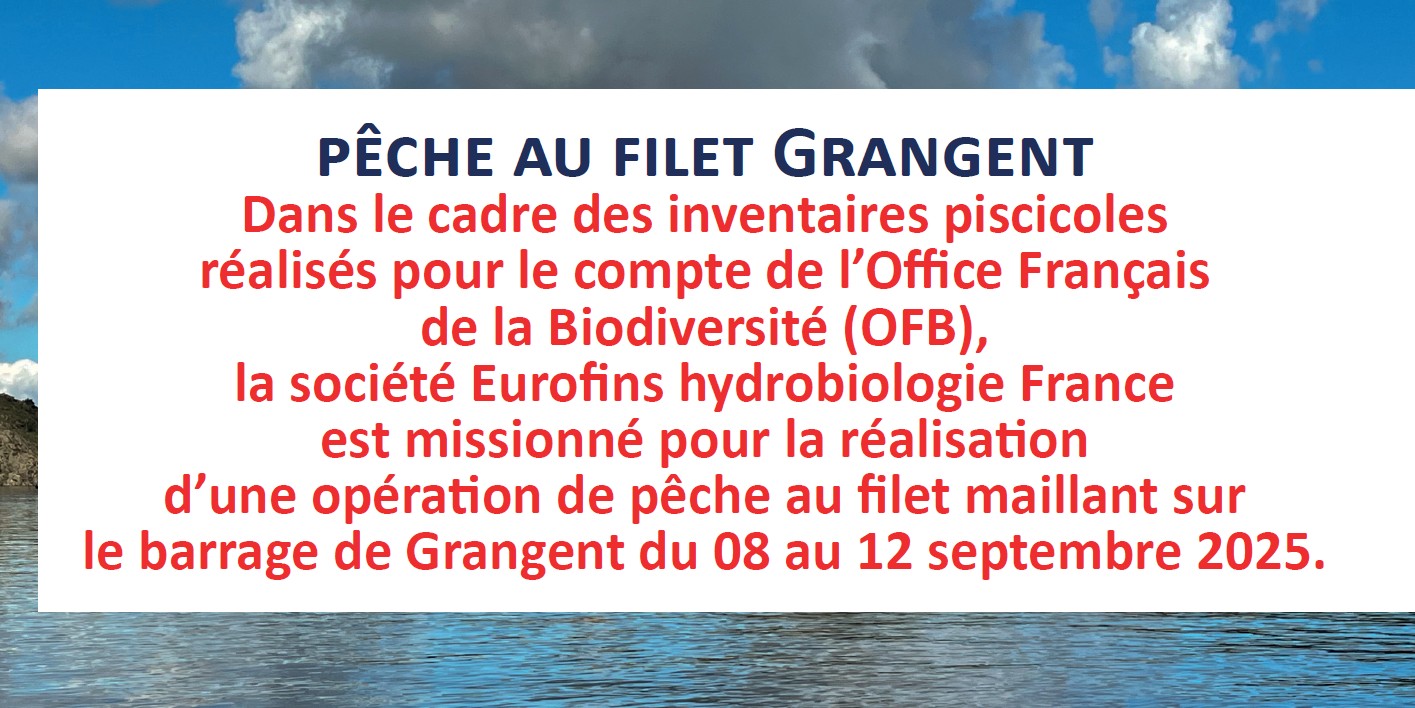 Dans le cadre des inventaires piscicoles réalisés pour le compte de l’Office Français de la Biodiversité (OFB), la société Eurofins hydrobiologie France est missionnée pour la réalisation d’une opération de pêche au filet maillant sur le barrage de Grangent du 08 au 12 septembre 2025.