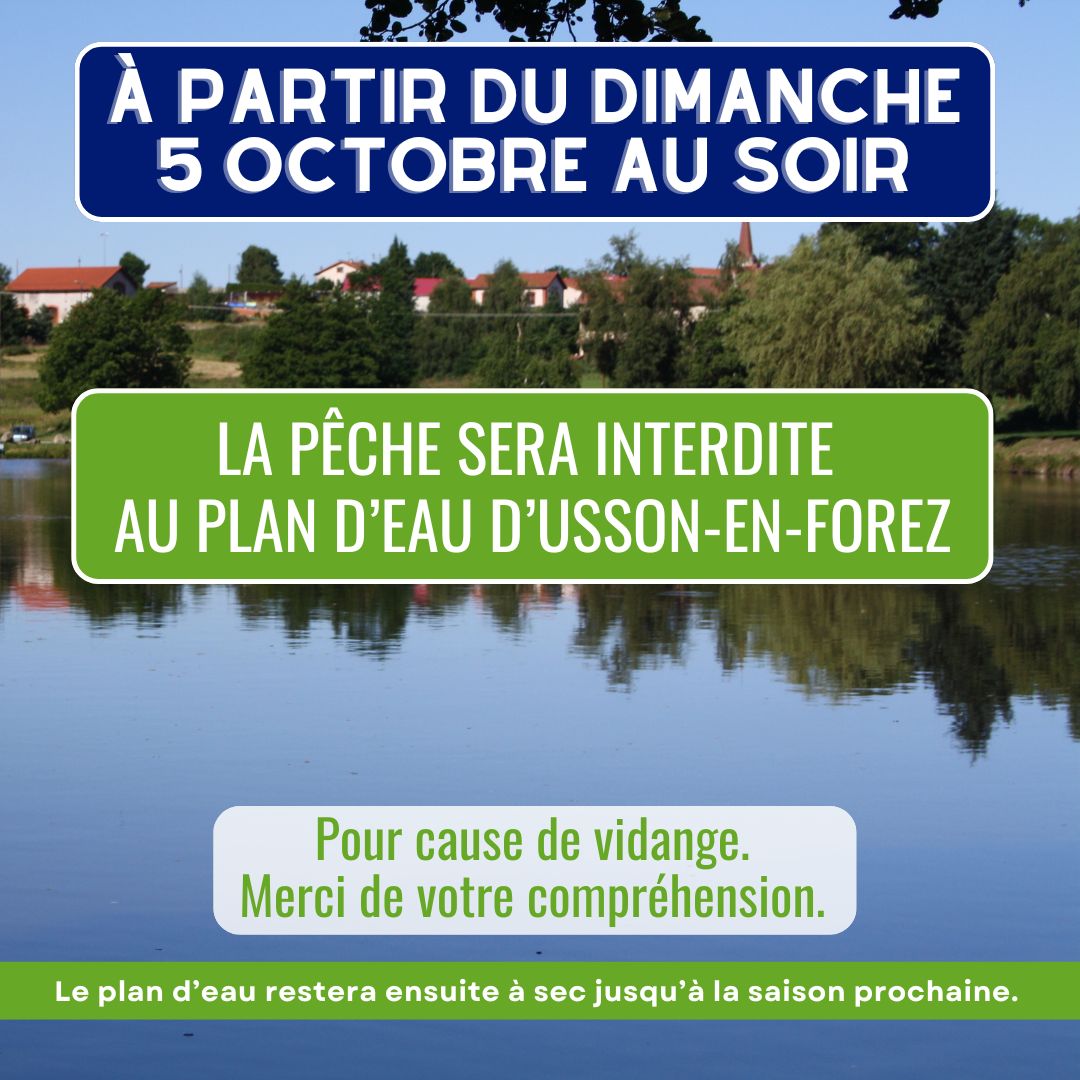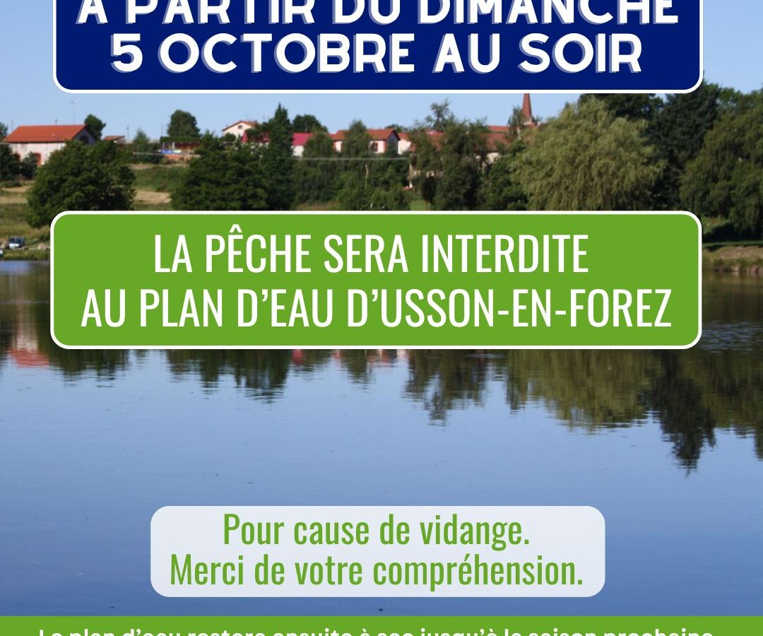 Pêche interdite au plan d’eau d’Usson en Forez à partir du 5 octobre au soir 3 octobre 2025 AccueilActualitésPêche interdite au plan d’eau d’Usson en Forez à partir du 5 octobre au soir 𝗜𝗡𝗙𝗢𝗥𝗠𝗔𝗧𝗜𝗢𝗡 𝗜𝗠𝗣𝗢𝗥𝗧𝗔𝗡𝗧𝗘 Pêche interdite au plan d’eau d’Usson-en-Forez à partir du dimanche 5 octobre au soir (pour cause de vidange). Le plan d’eau restera ensuite à sec jusqu’à la saison prochaine. Merci de votre compréhension. Partager cet article sur :