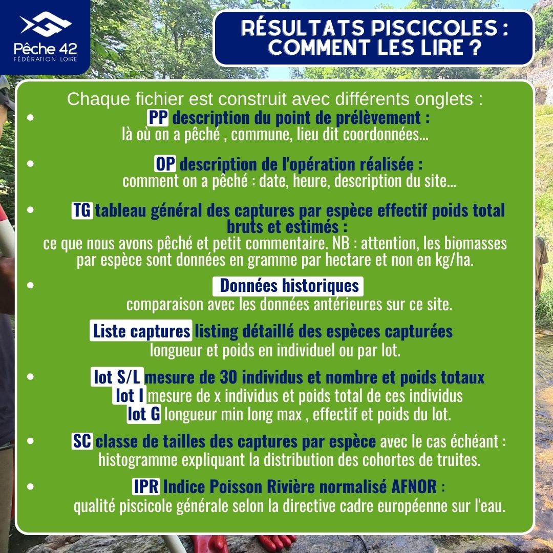 Les résultats des inventaires sont majoritairement donnés dans des fichiers Excel issus de l’extraction des opérations de pêche saisies sous ASPE (Application de Saisie des données Piscicoles et Environnementales : https://aspe.eaufrance.fr